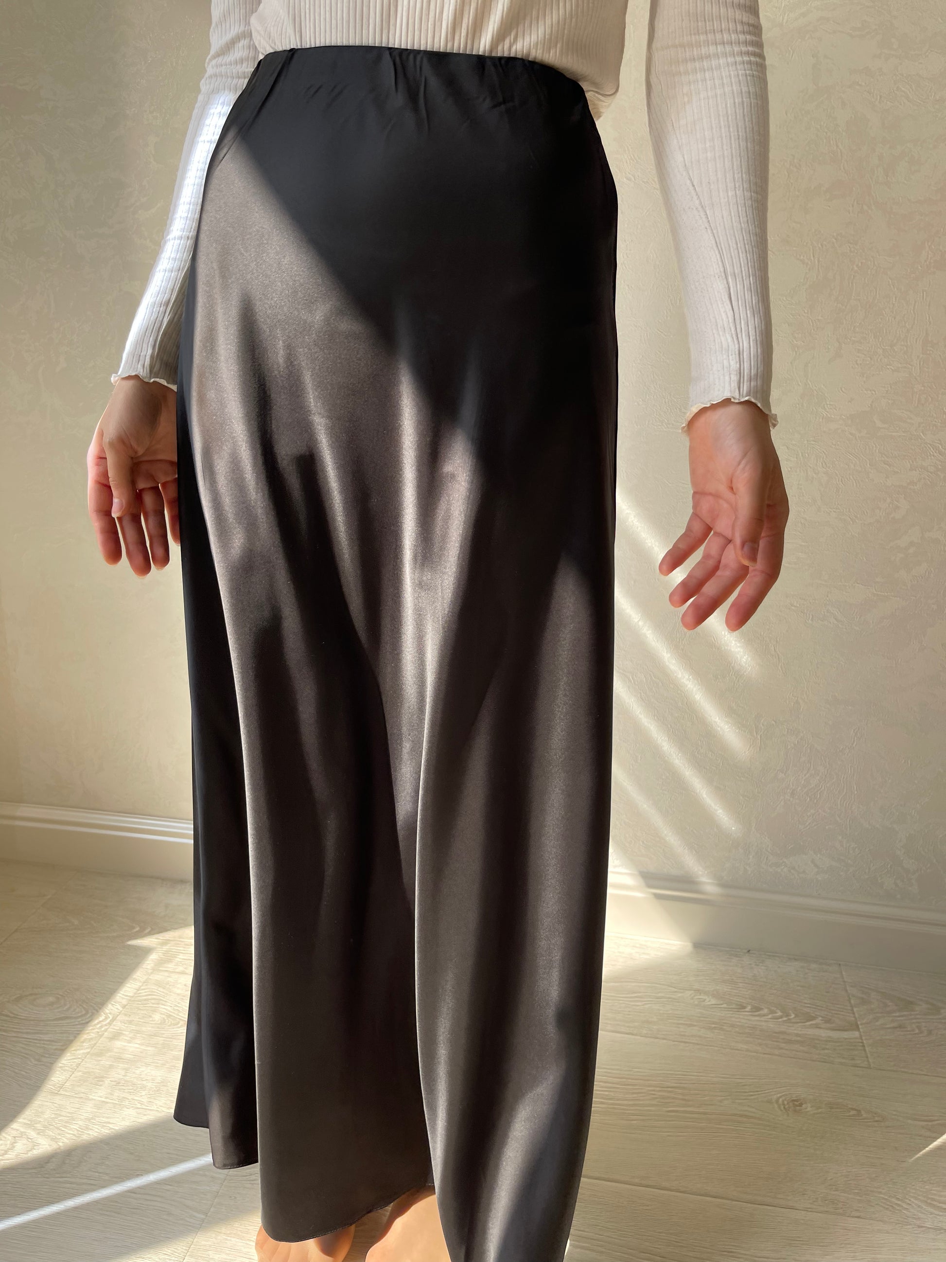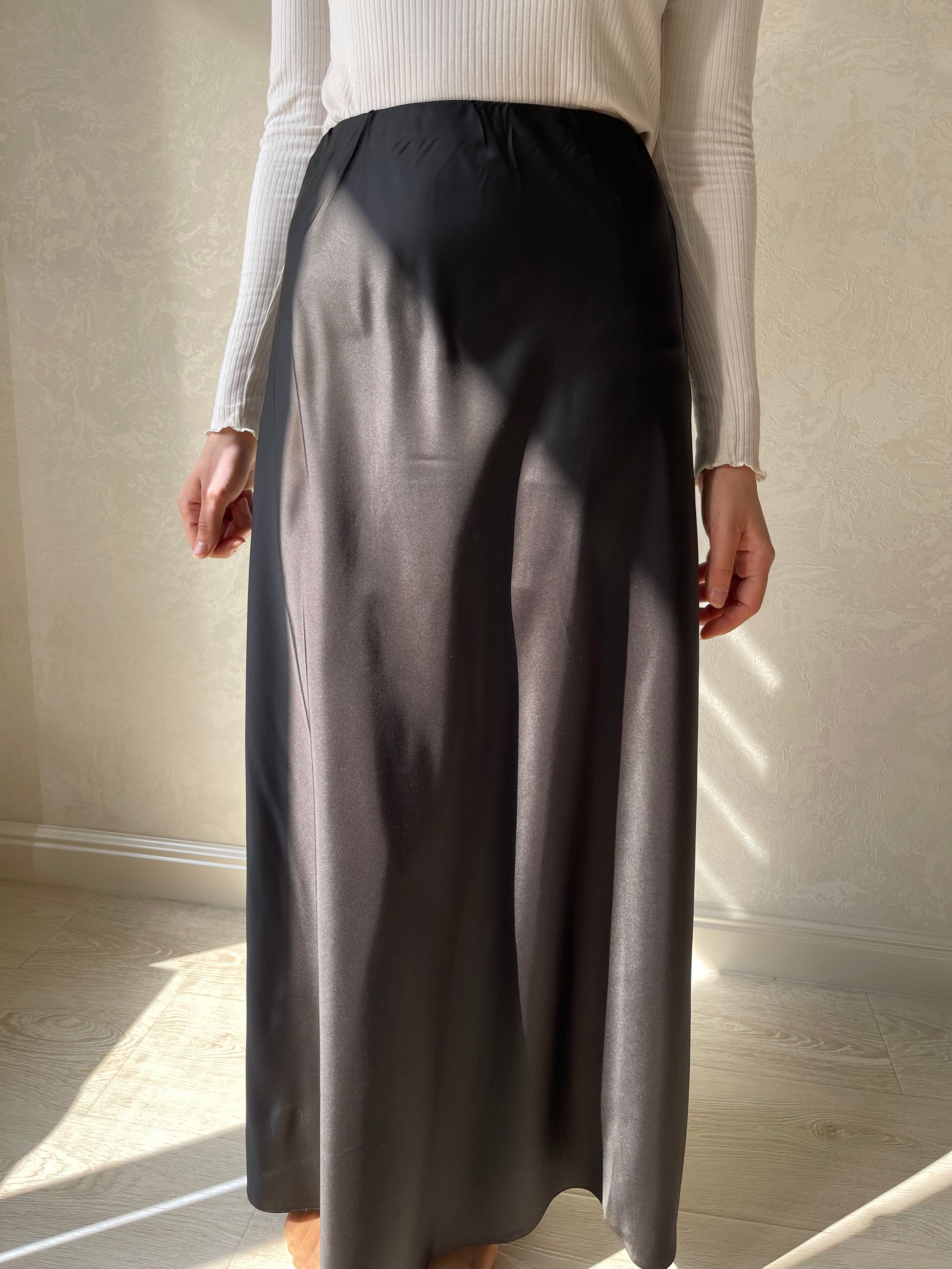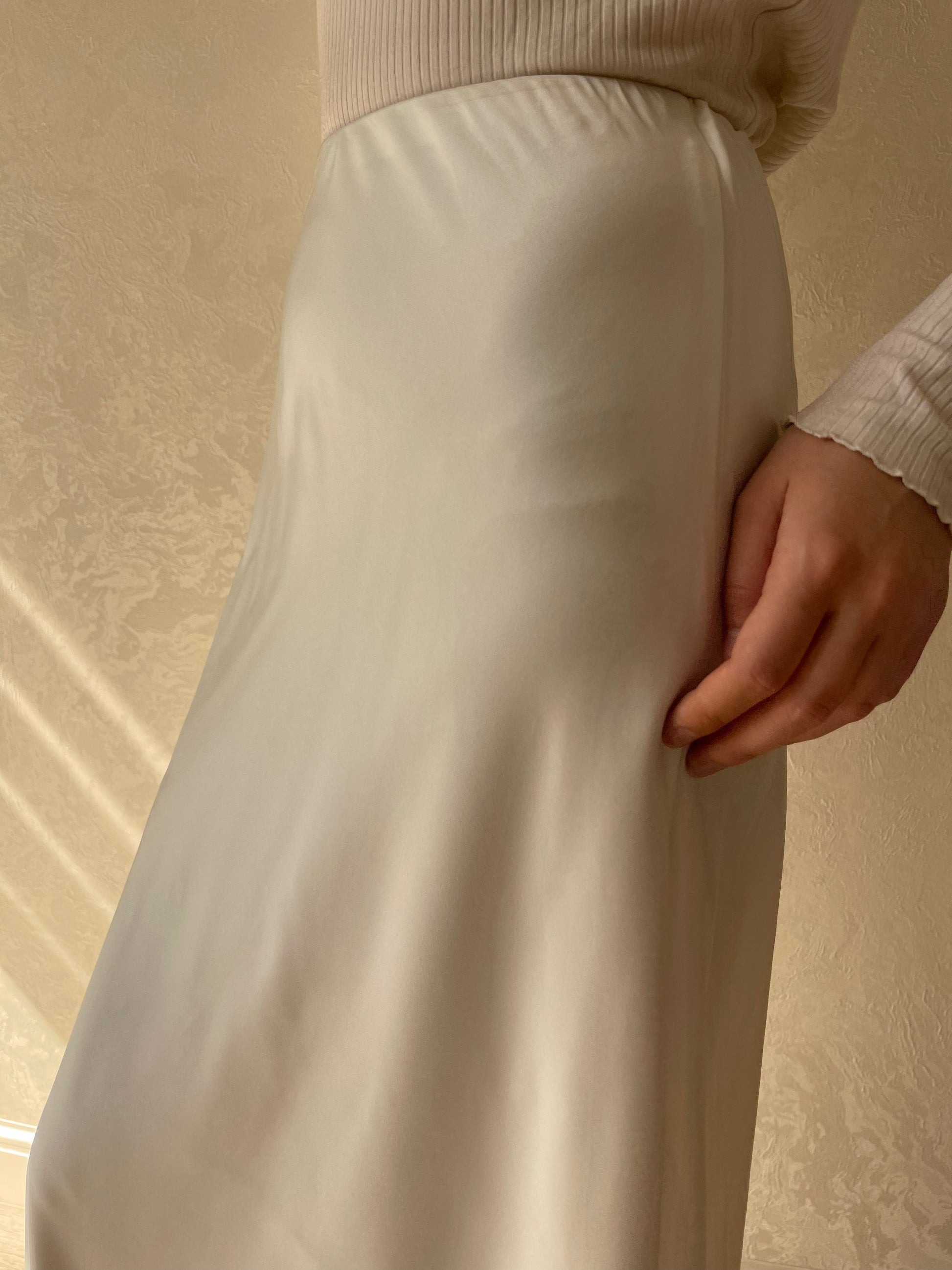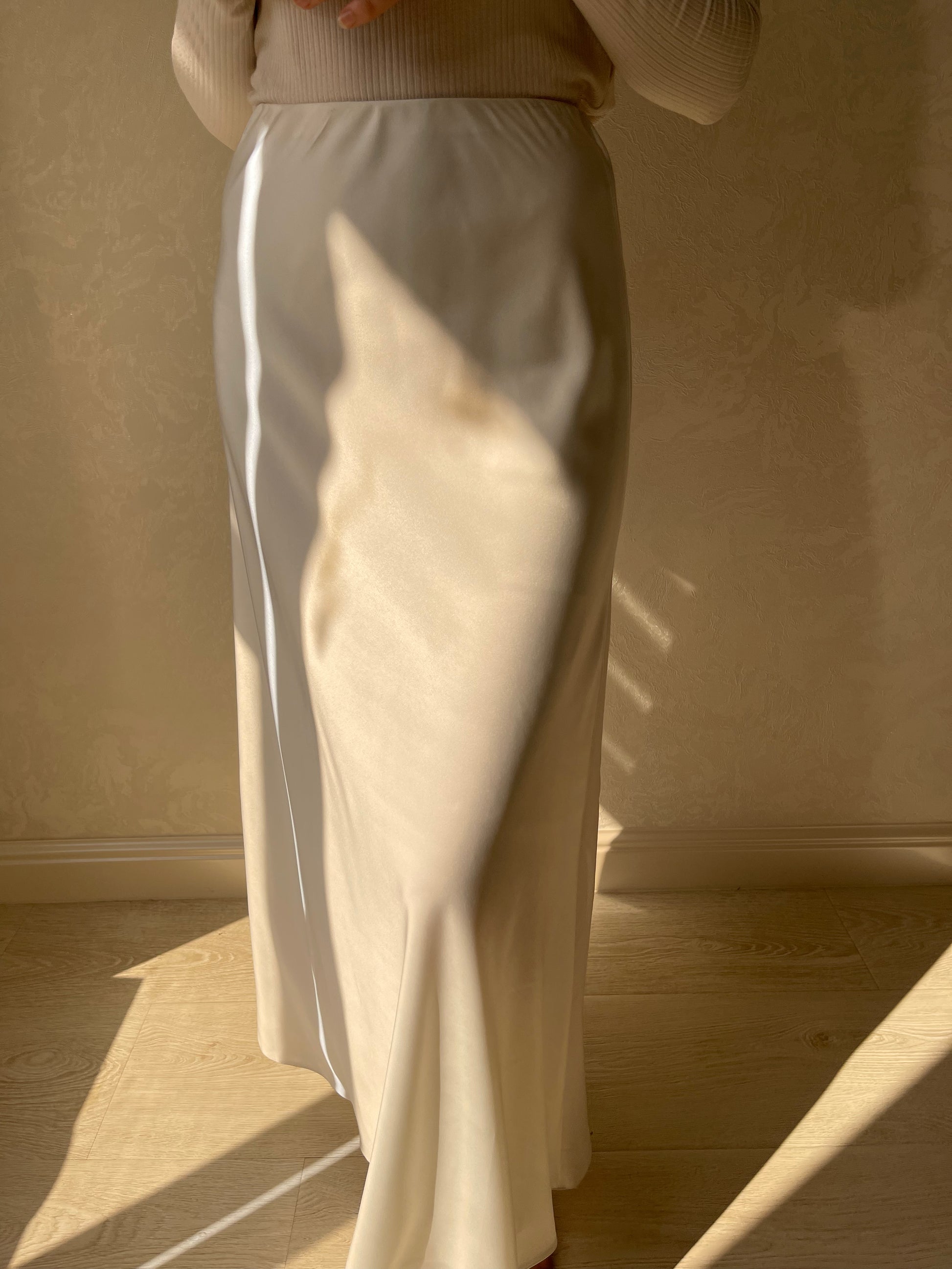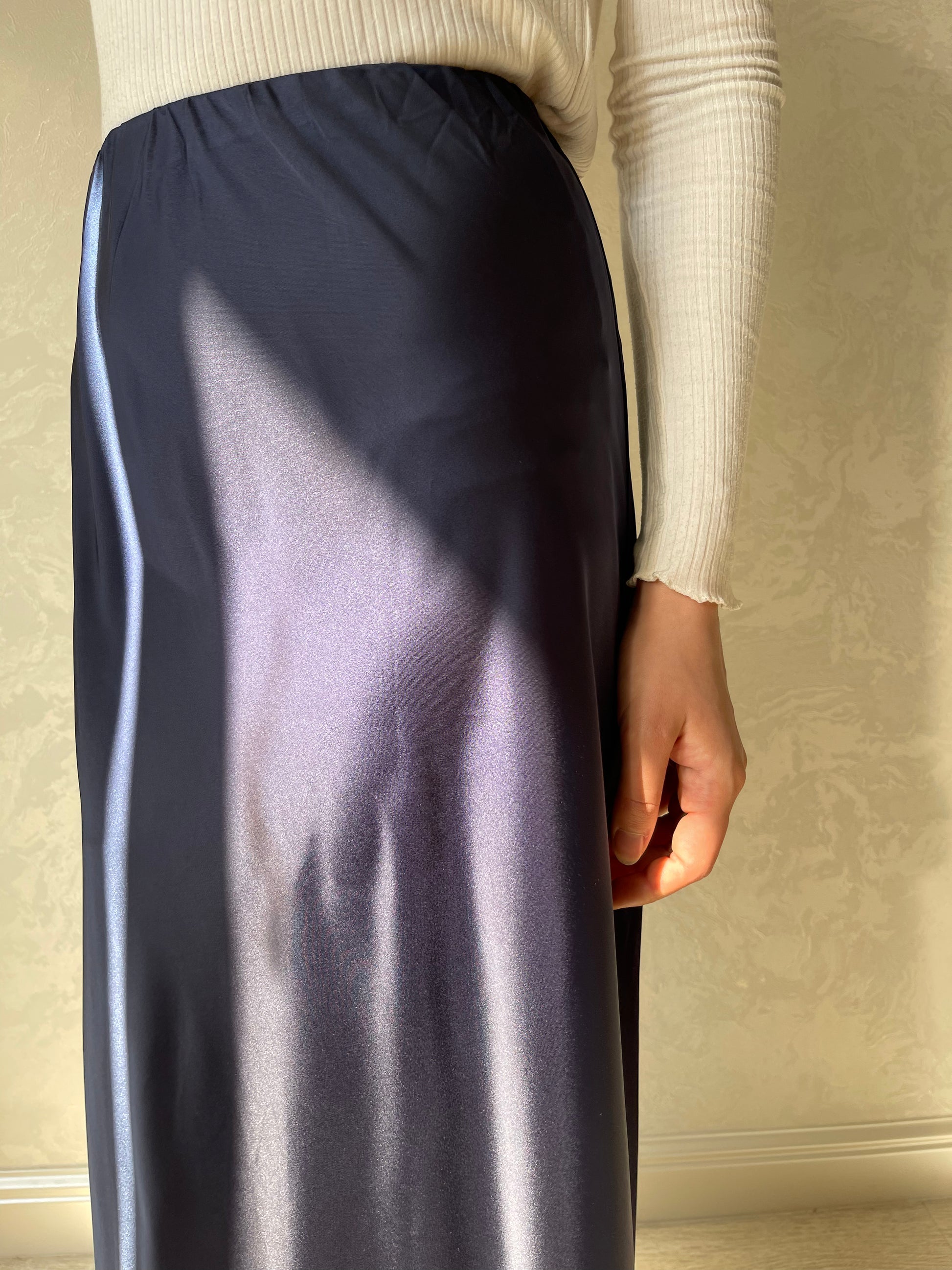 Jupe coupe en biais droite, tissu en satiné lisse, élastique à la taille.