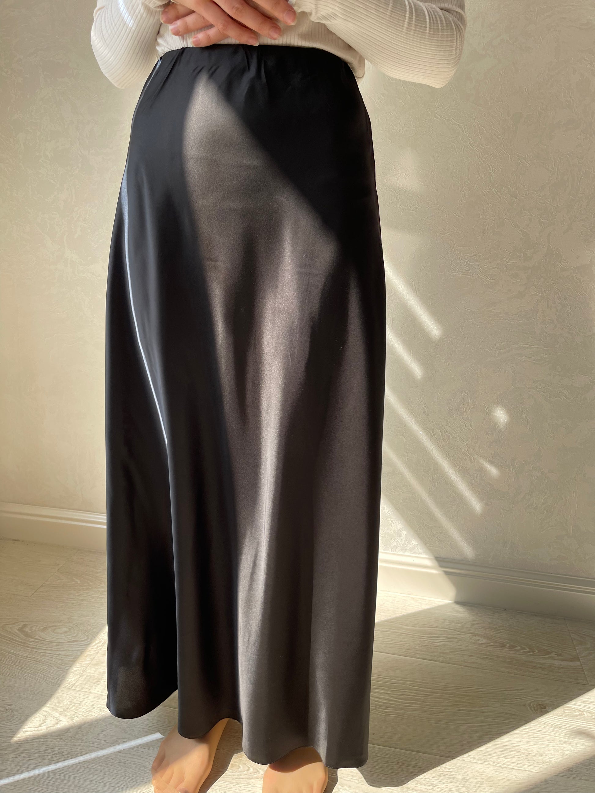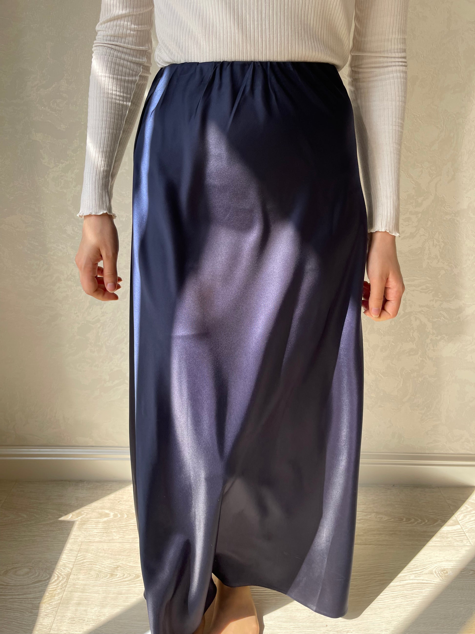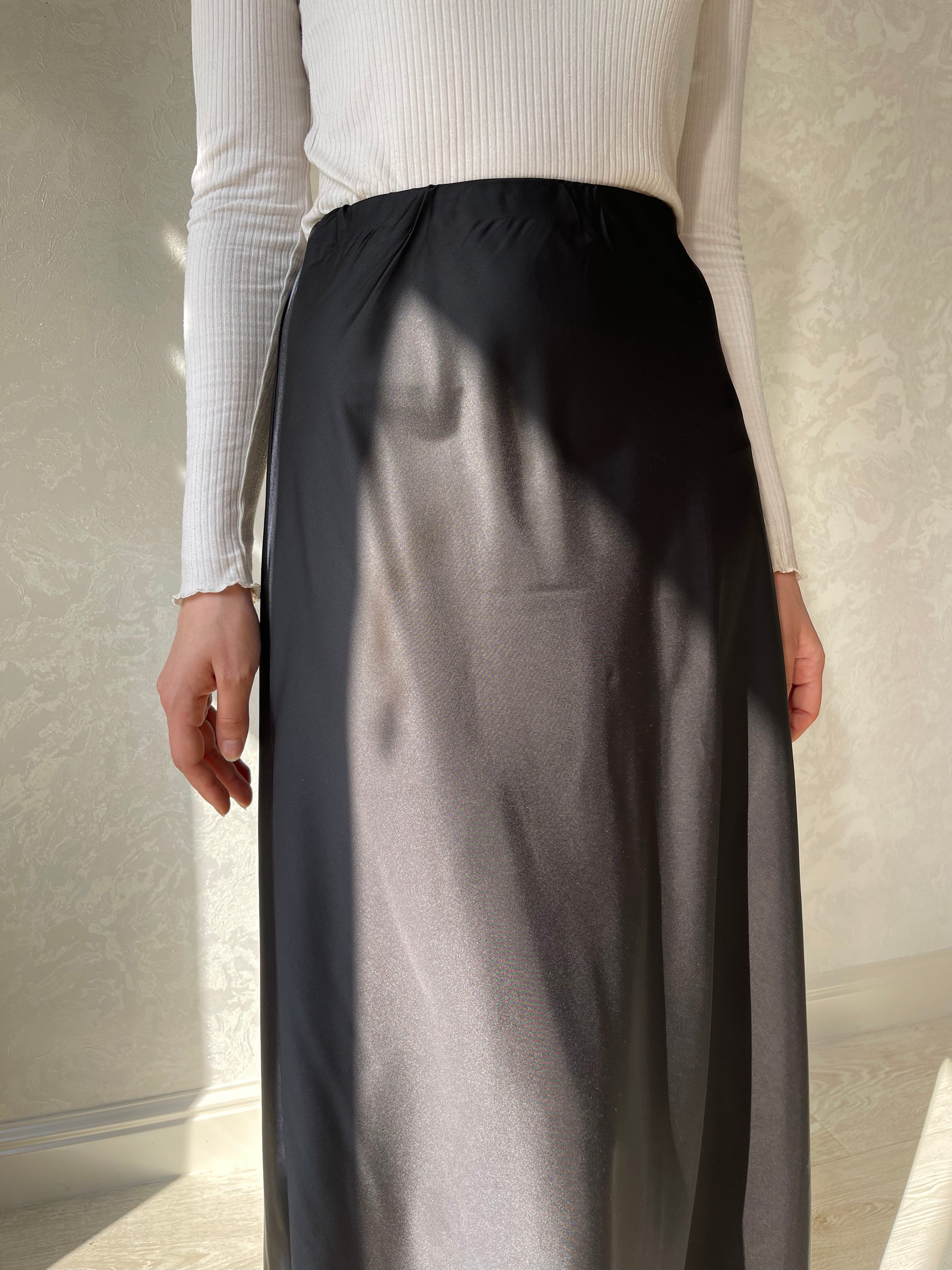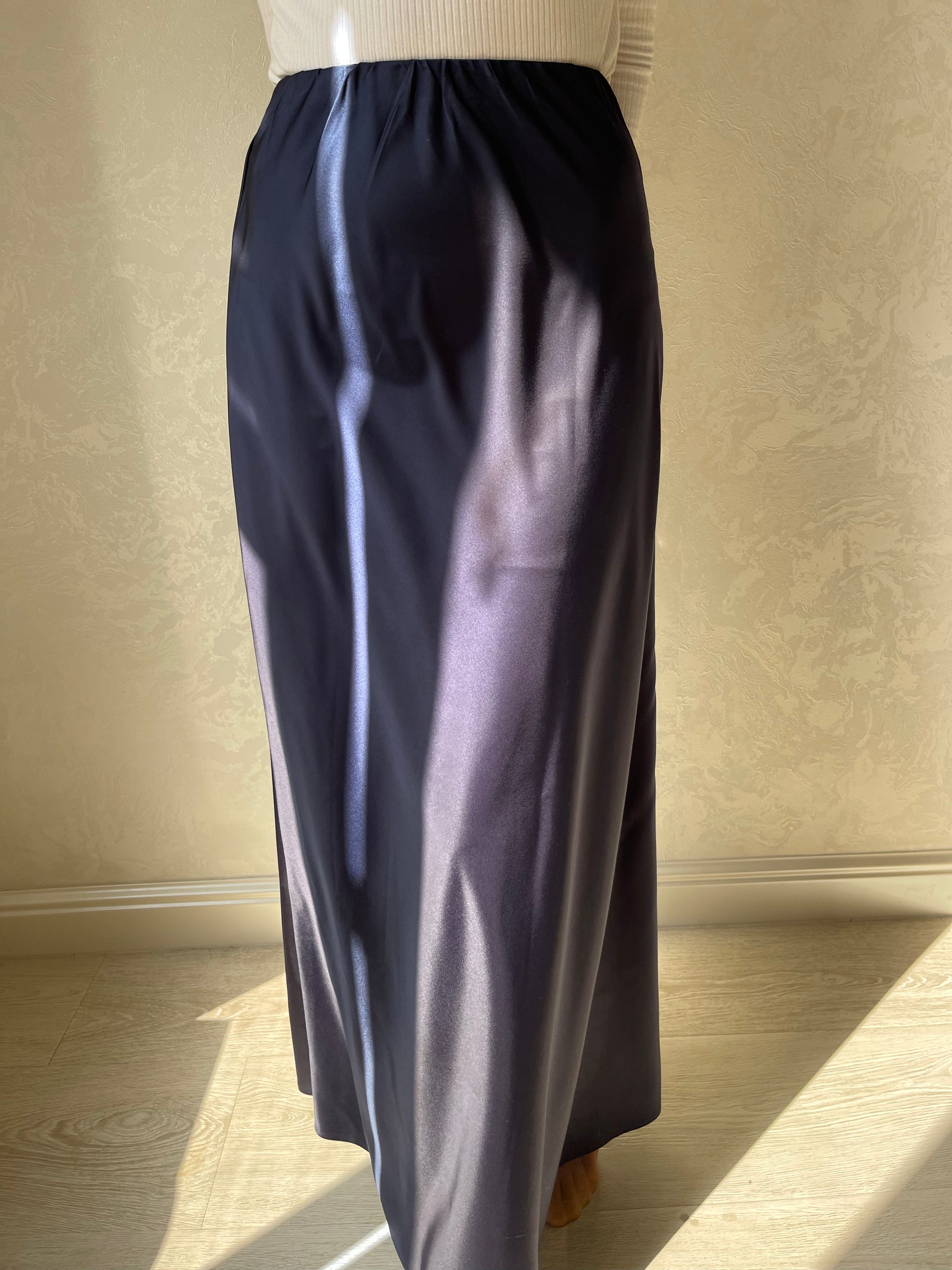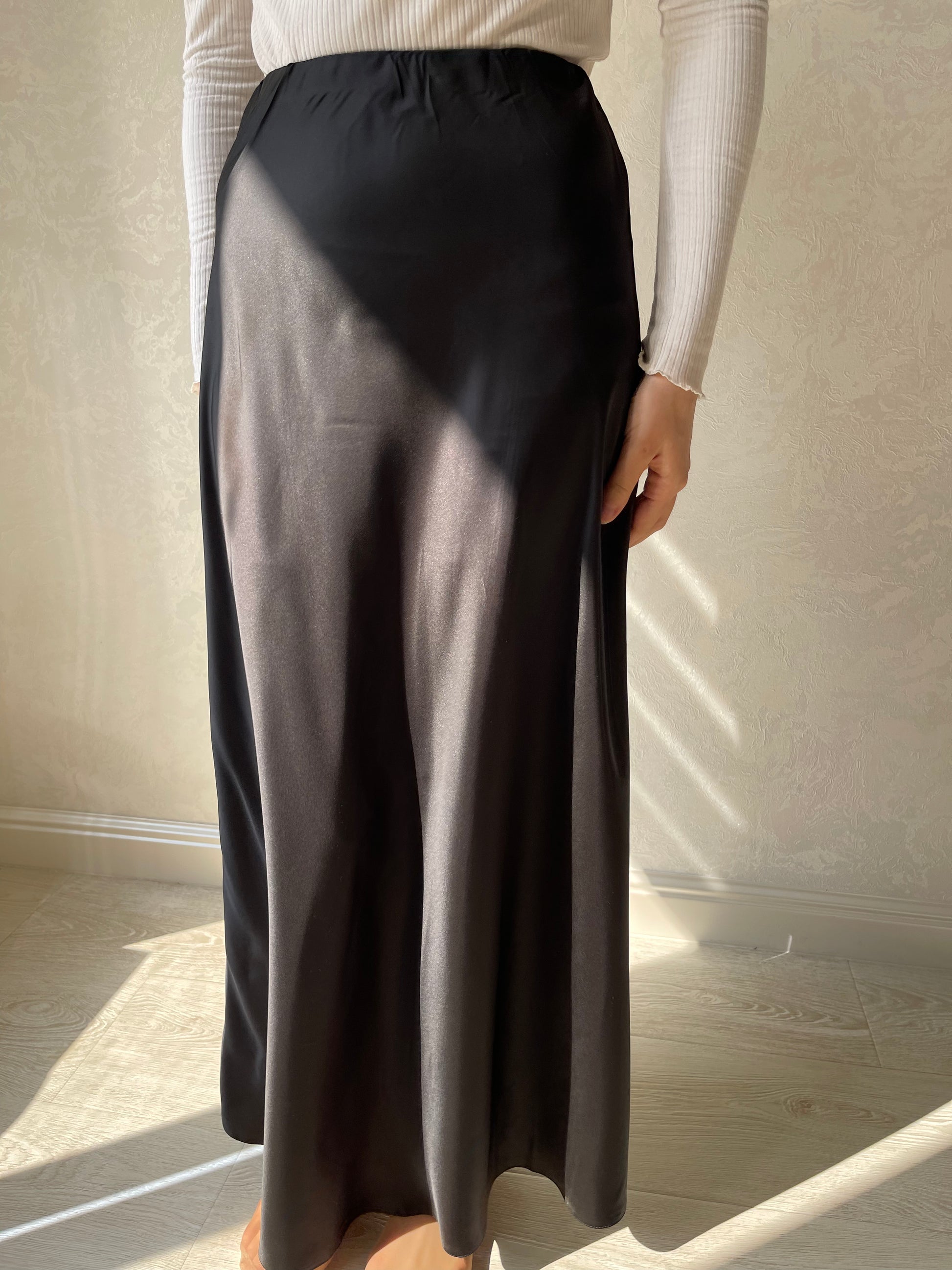 Jupe coupe en biais droite, tissu en satiné lisse, élastique à la taille.