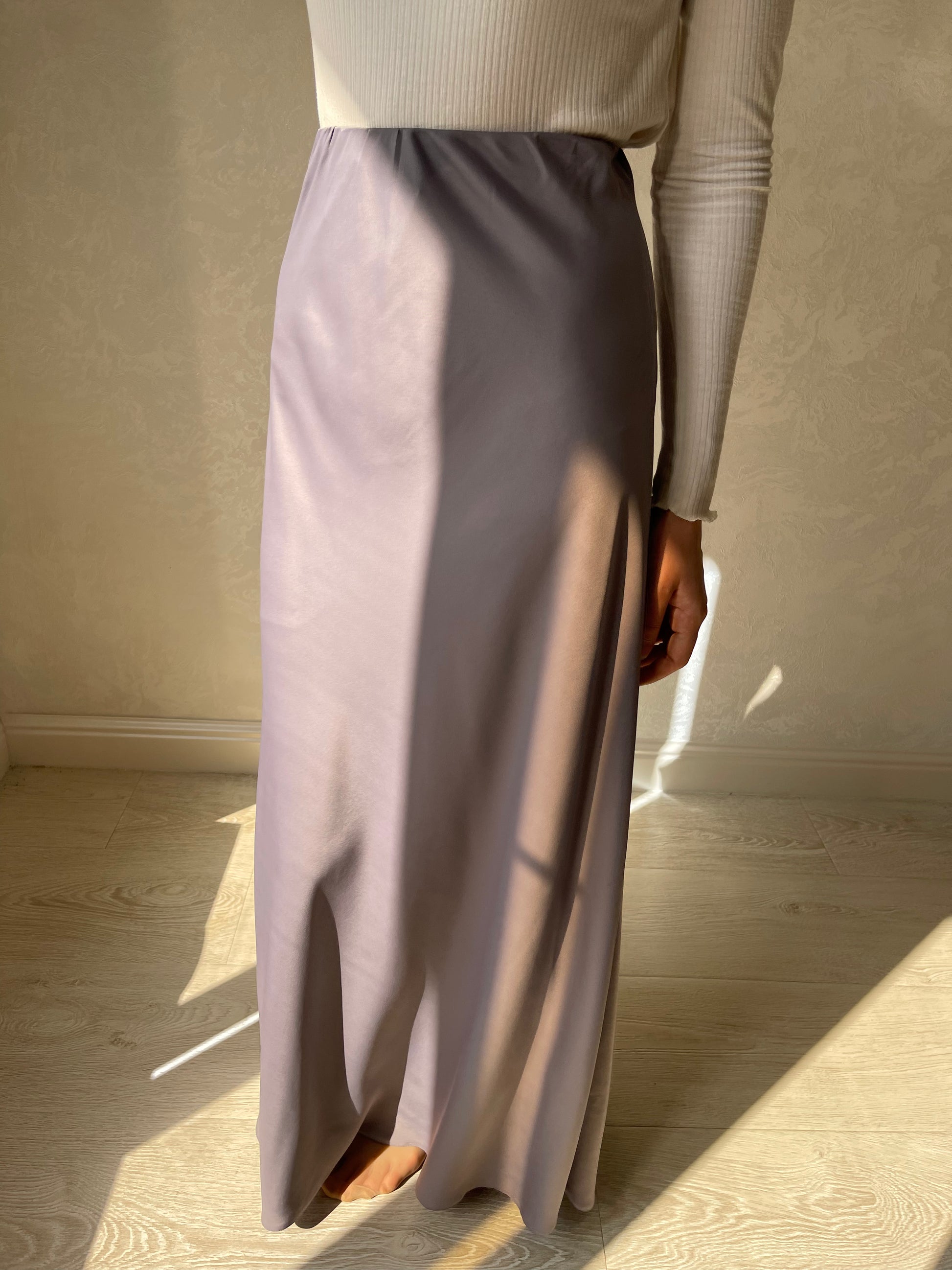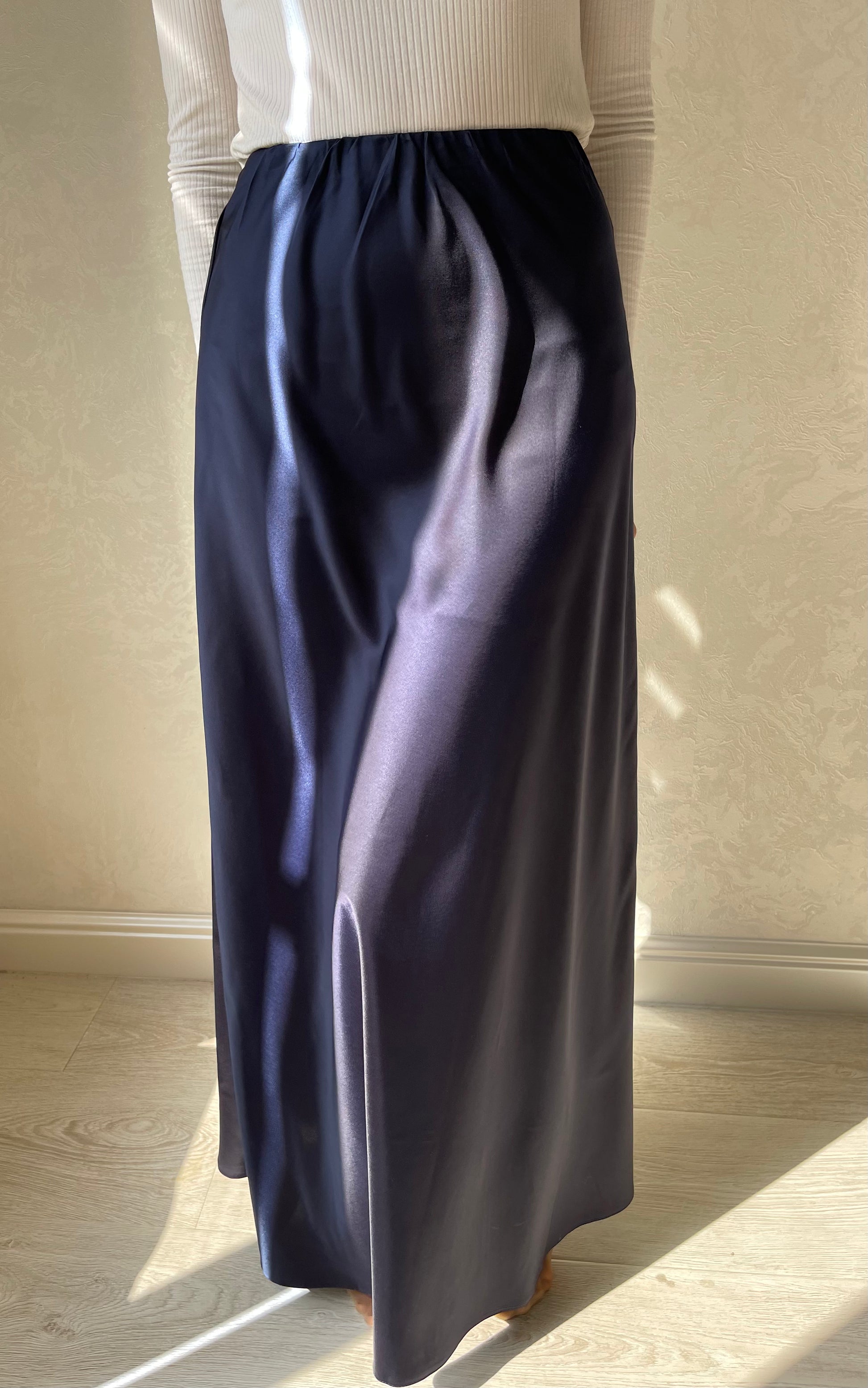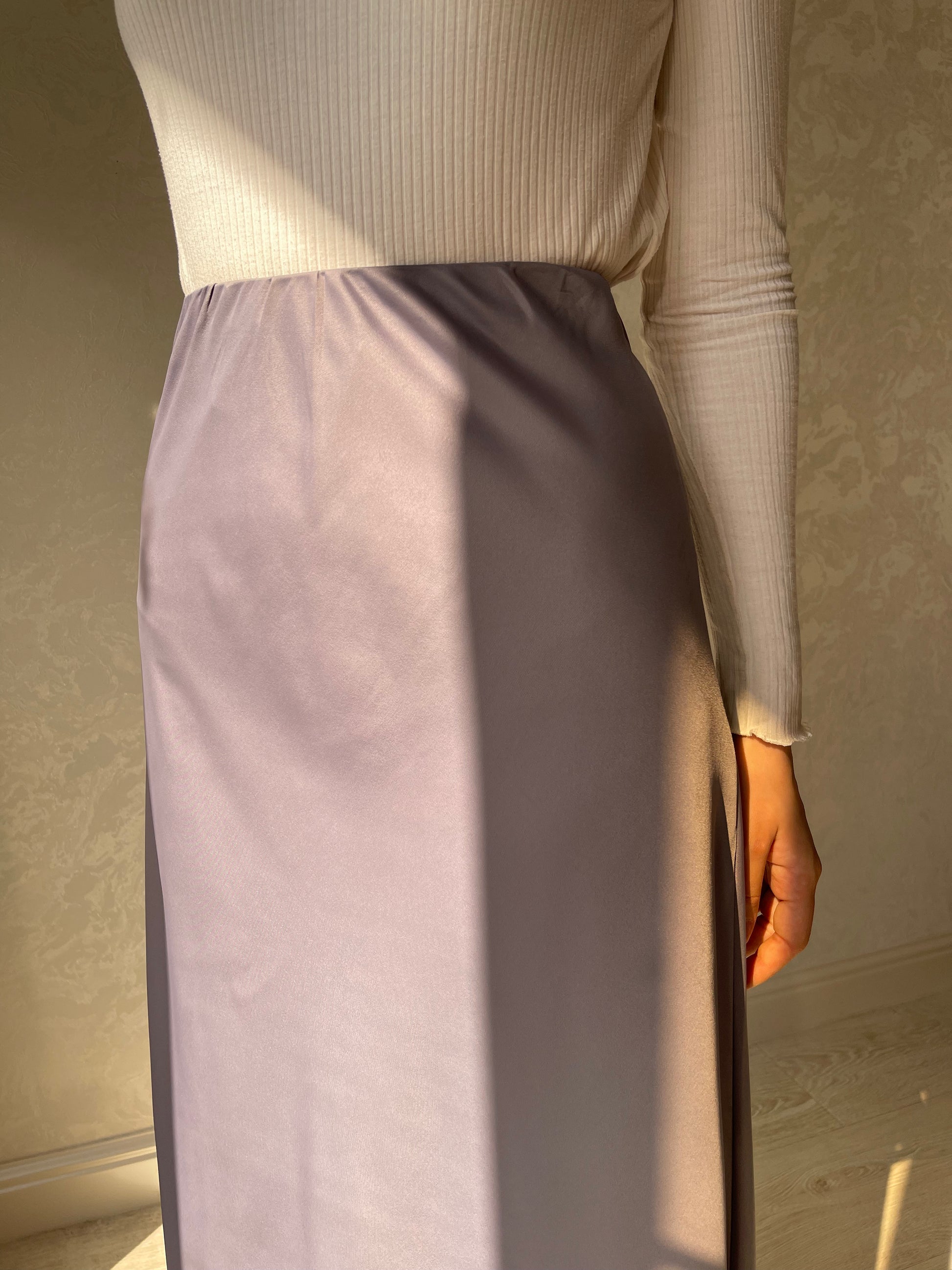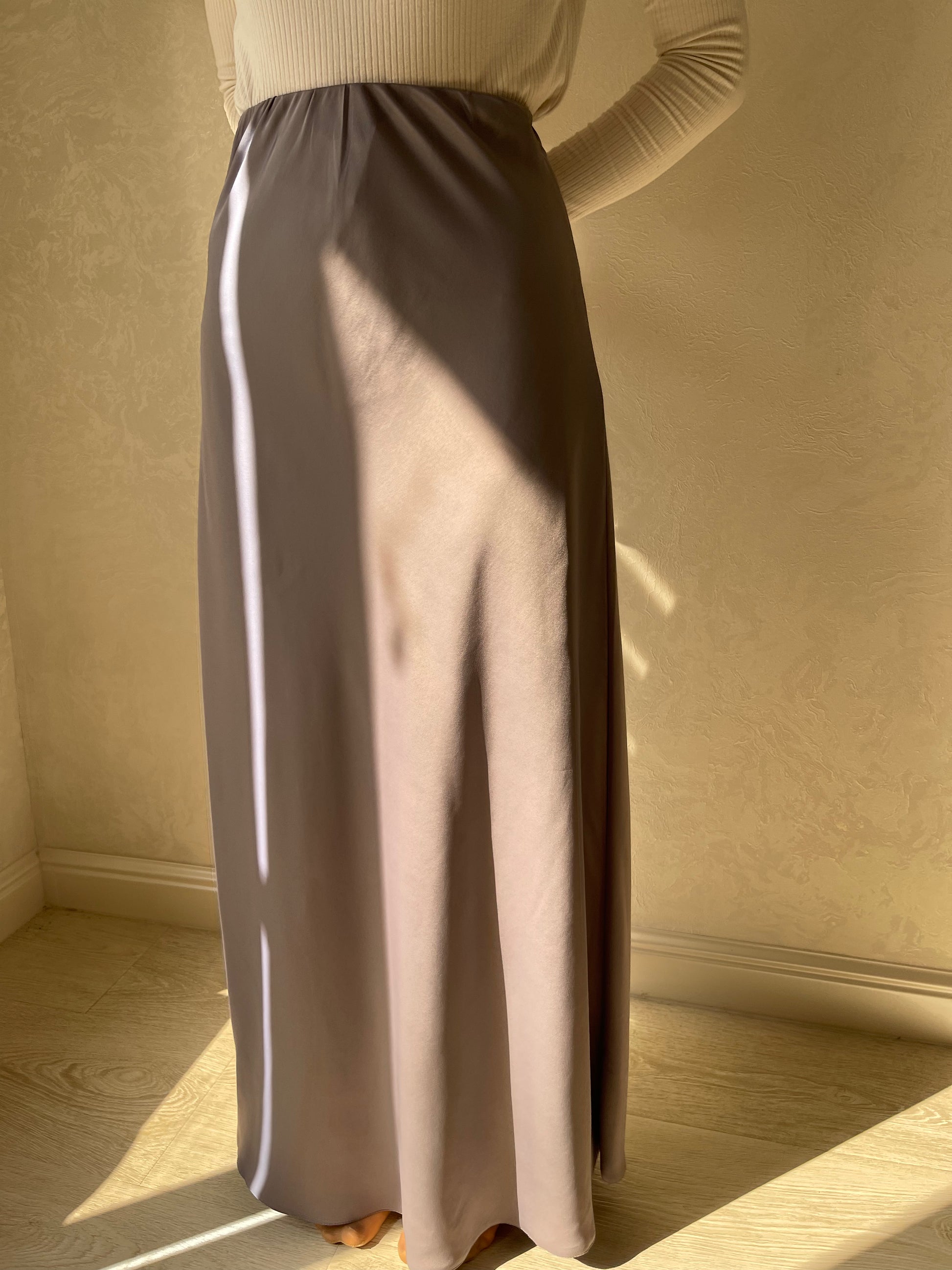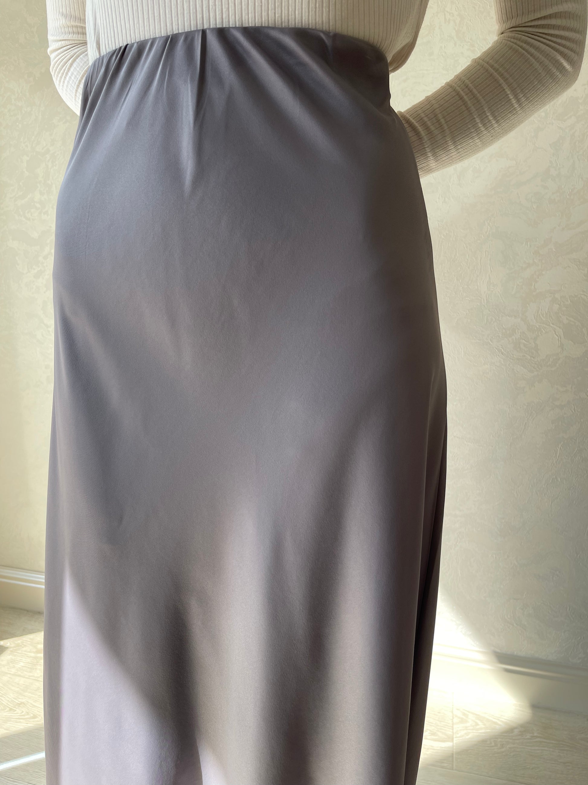 Jupe coupe en biais droite, tissu en satiné lisse, élastique à la taille.