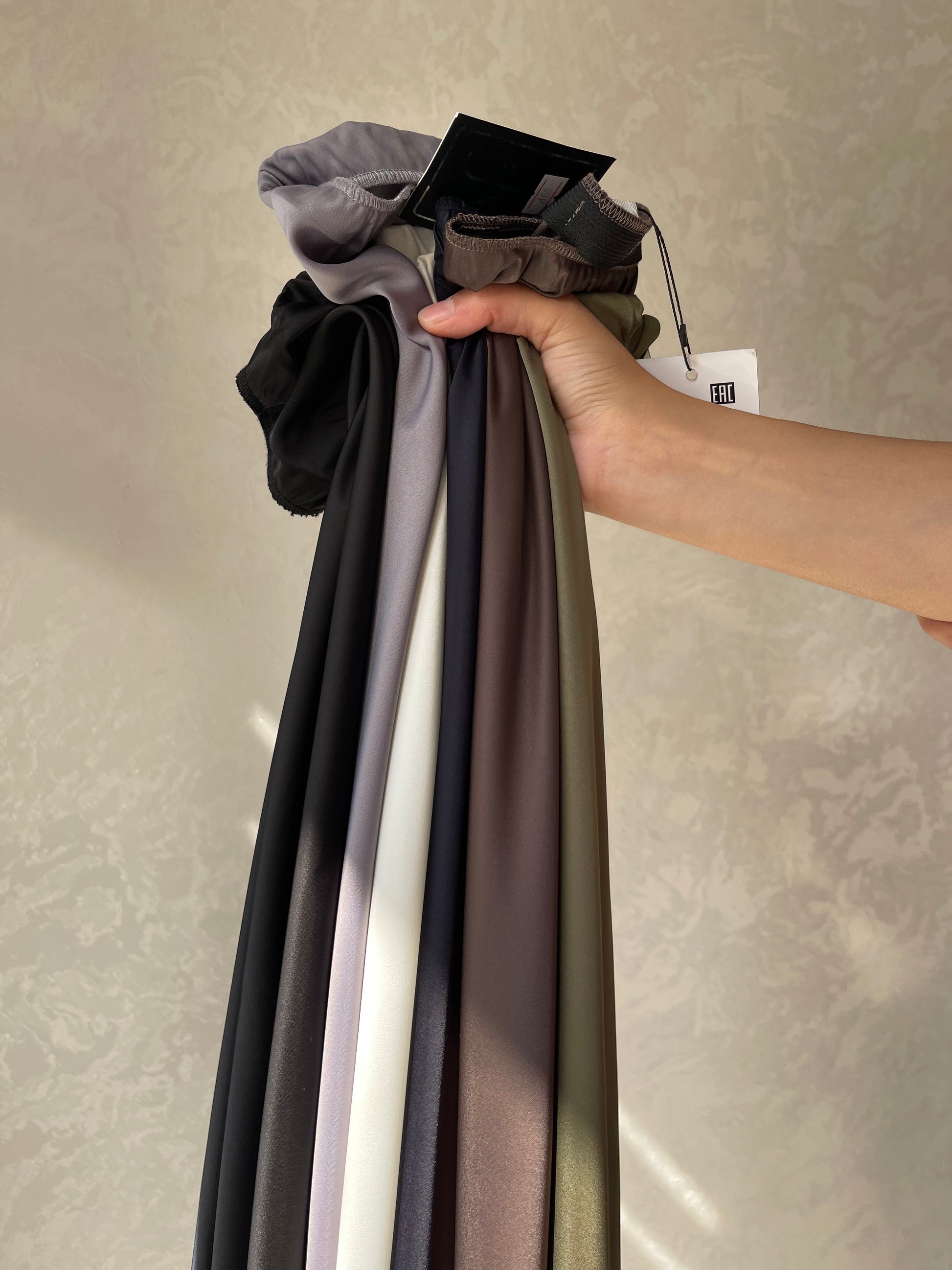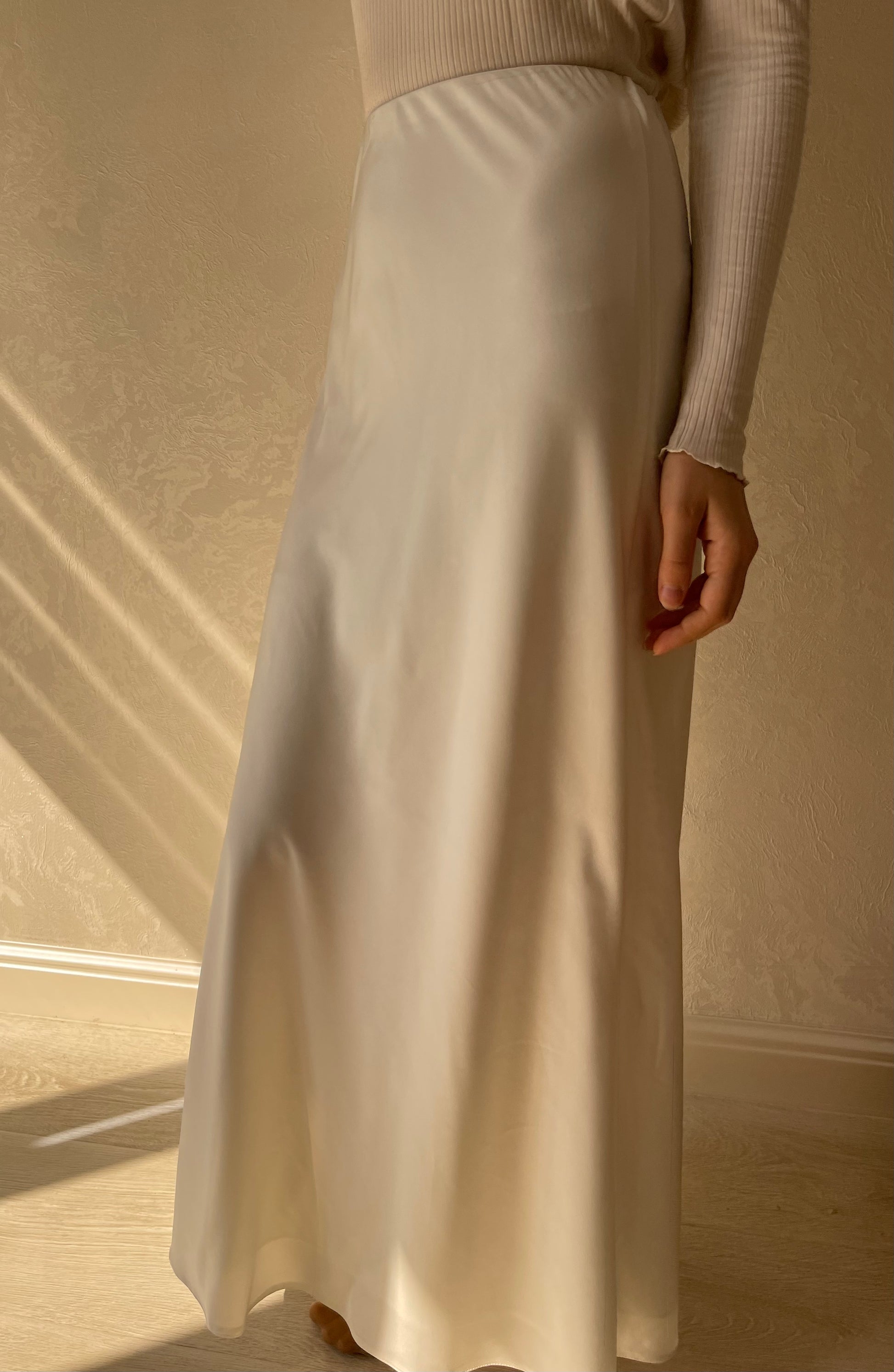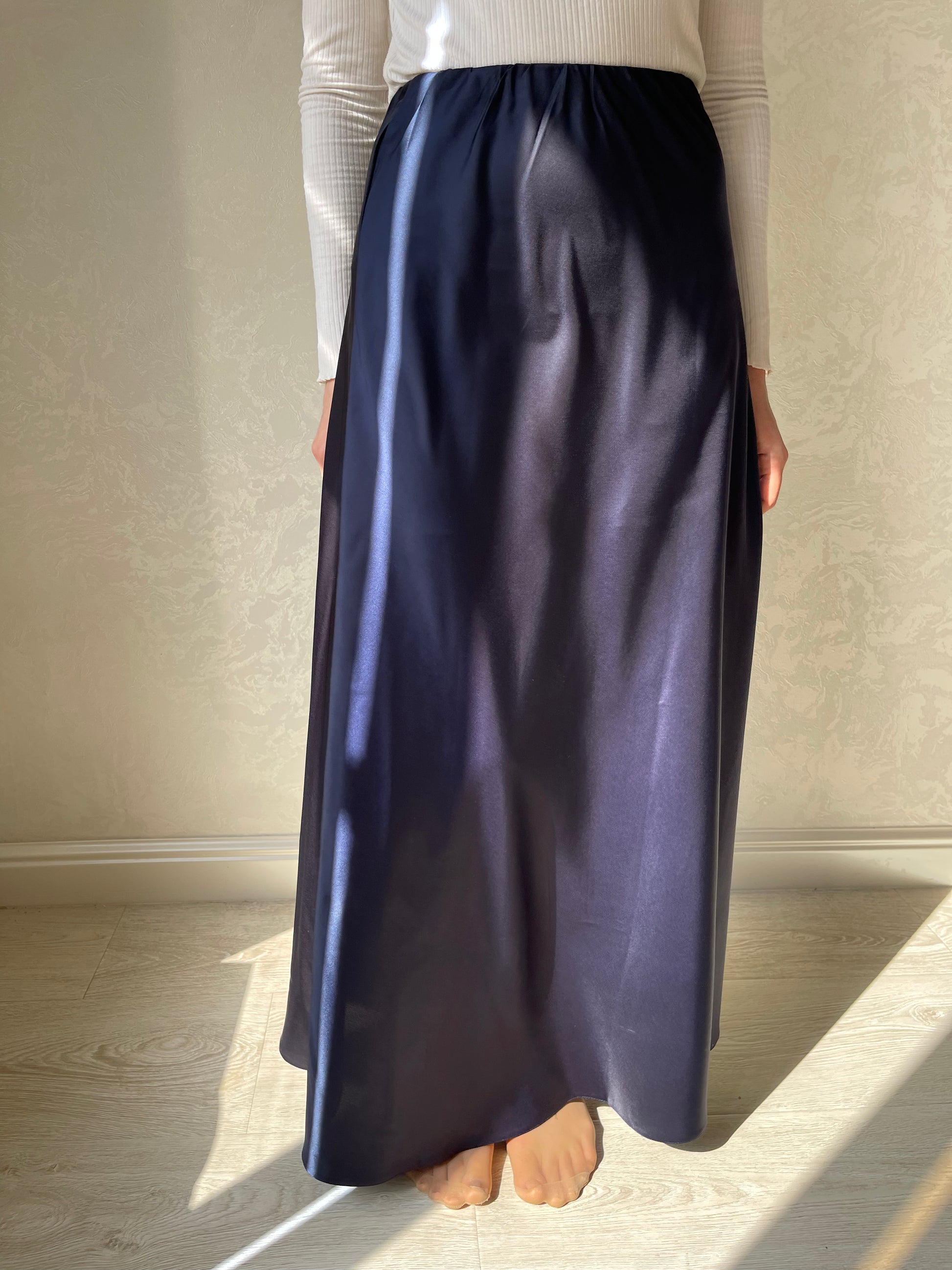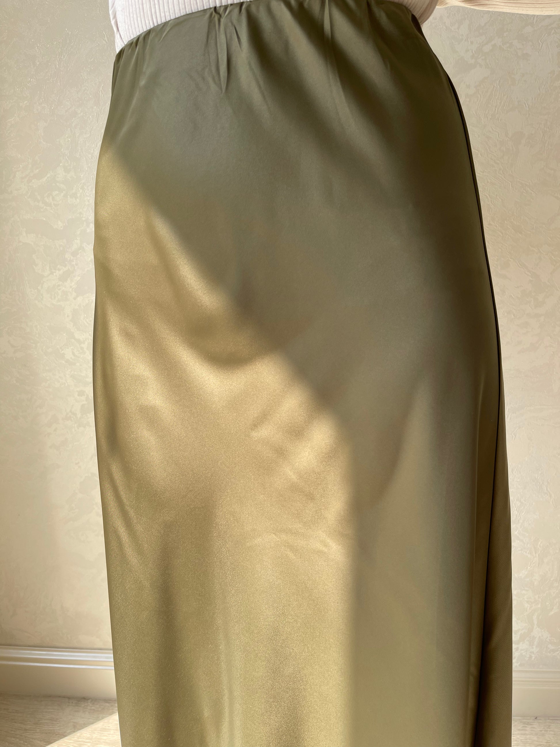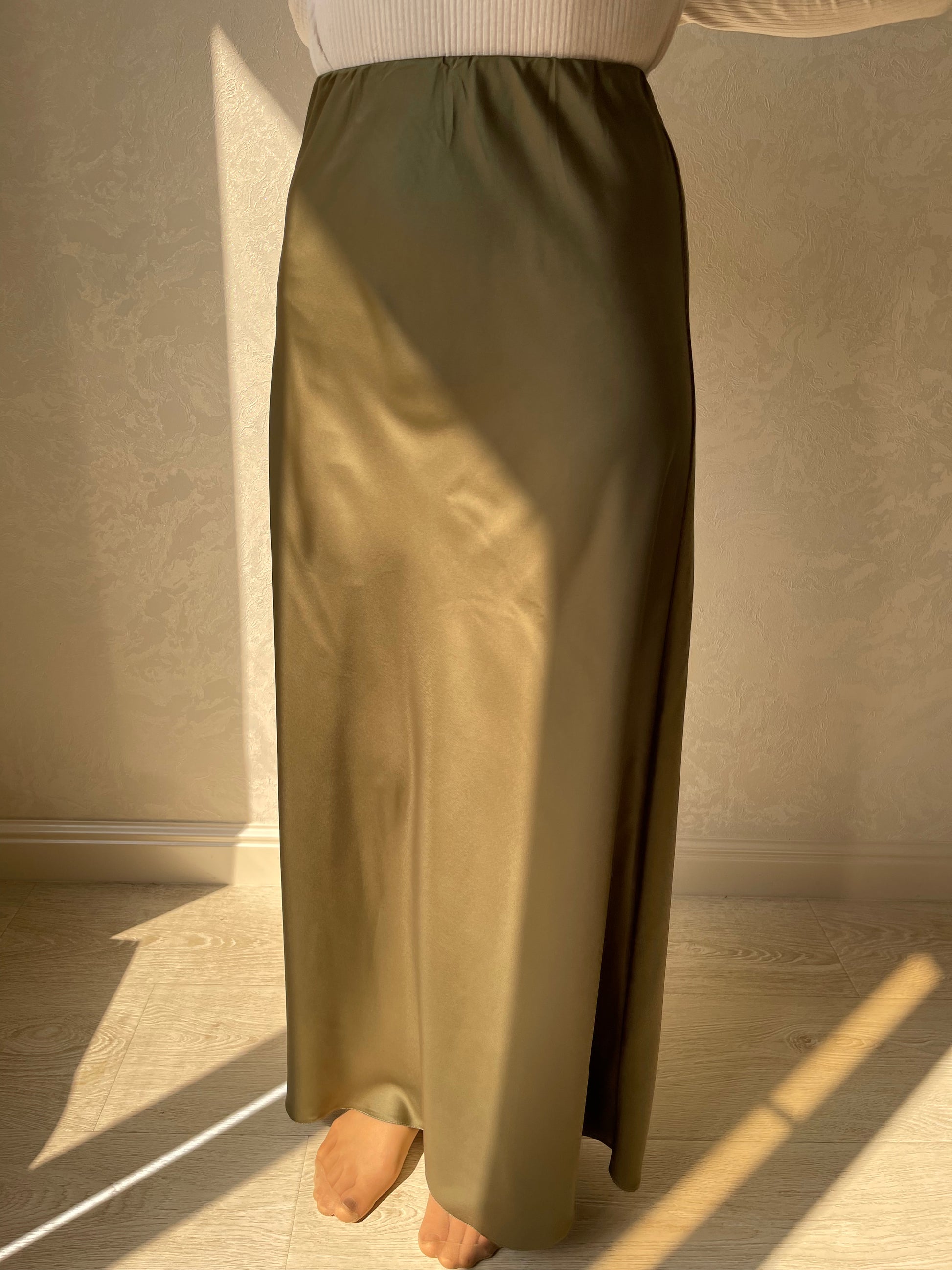 Jupe coupe en biais droite, tissu en satiné lisse, élastique à la taille.