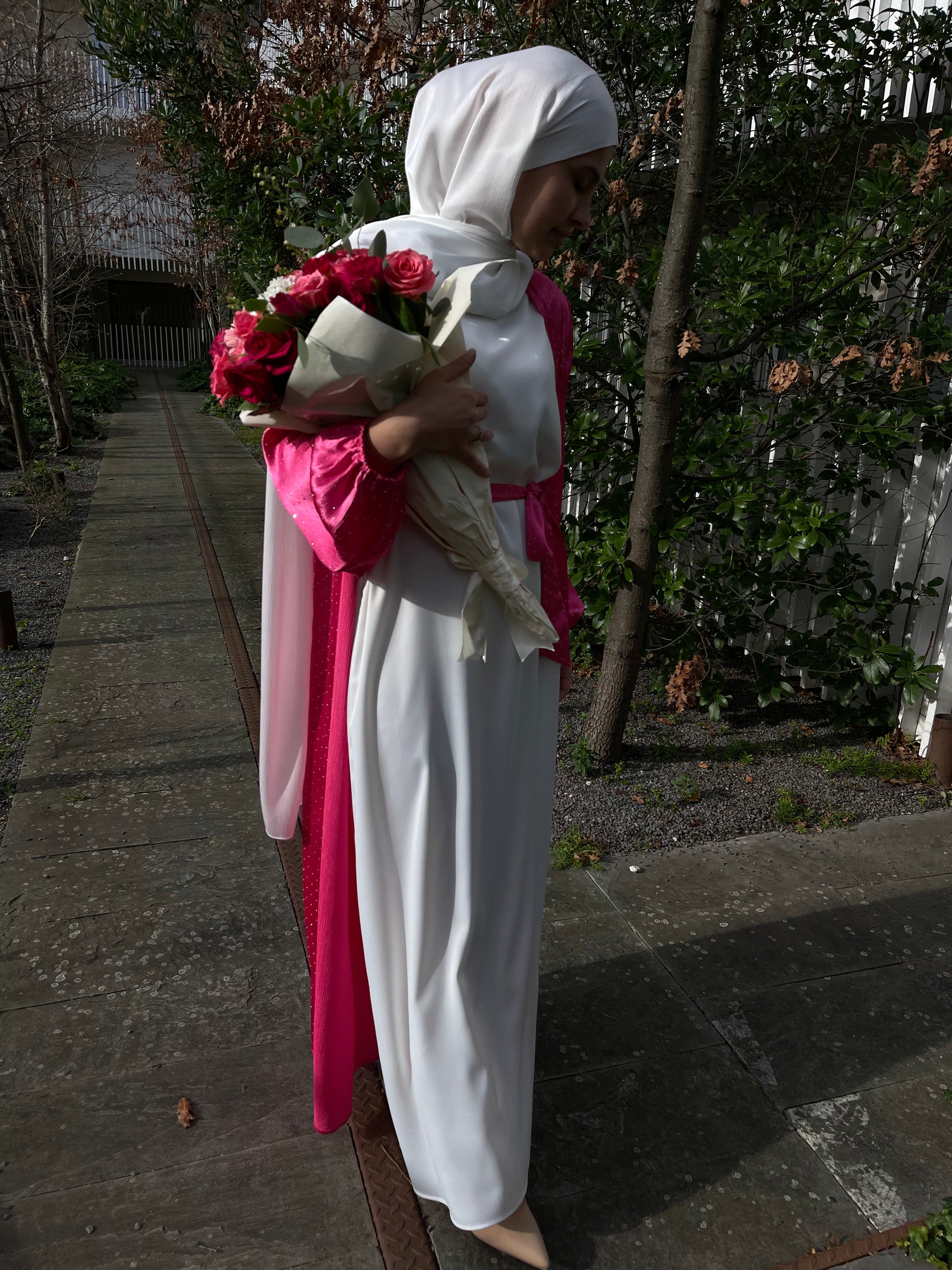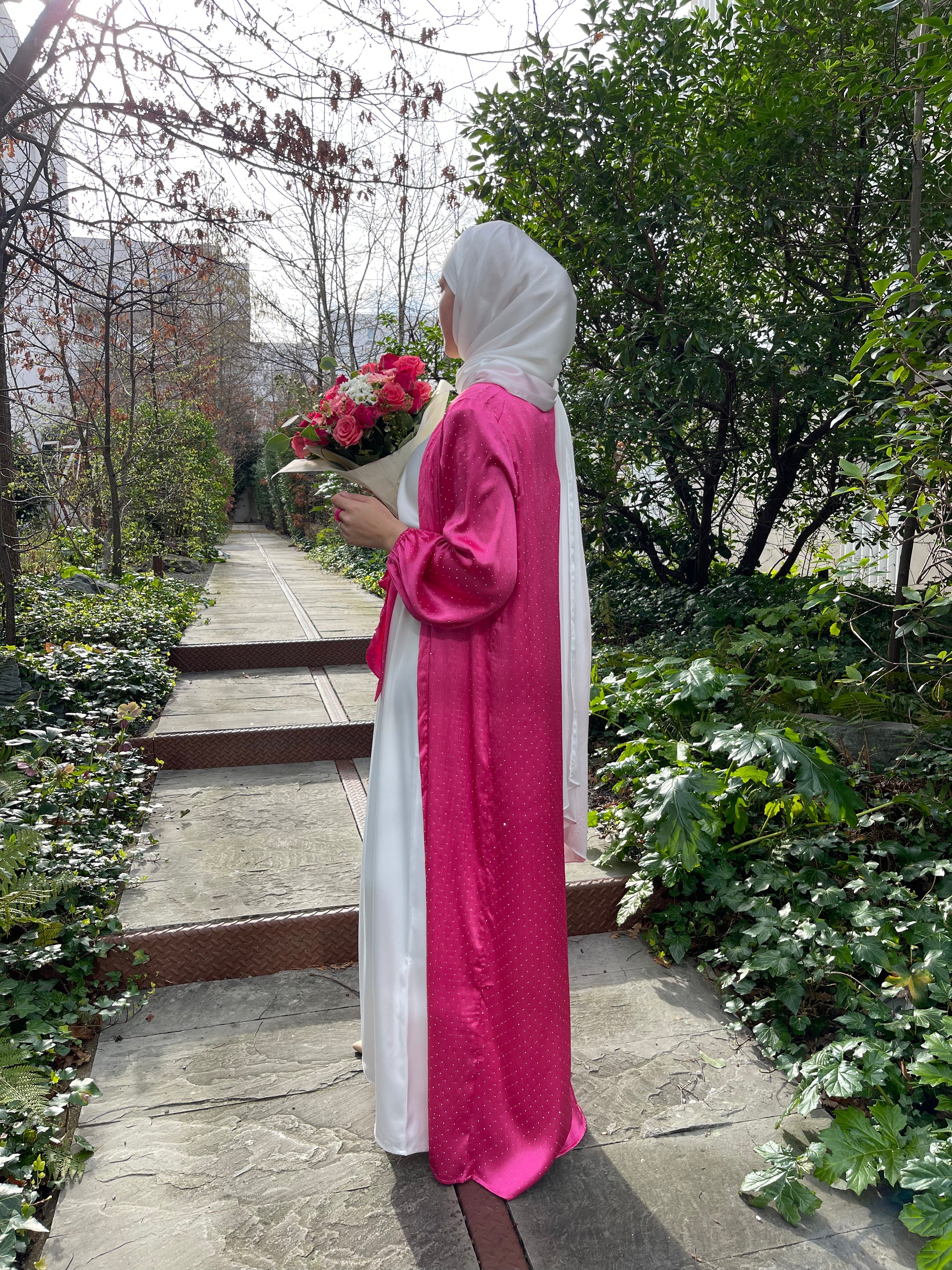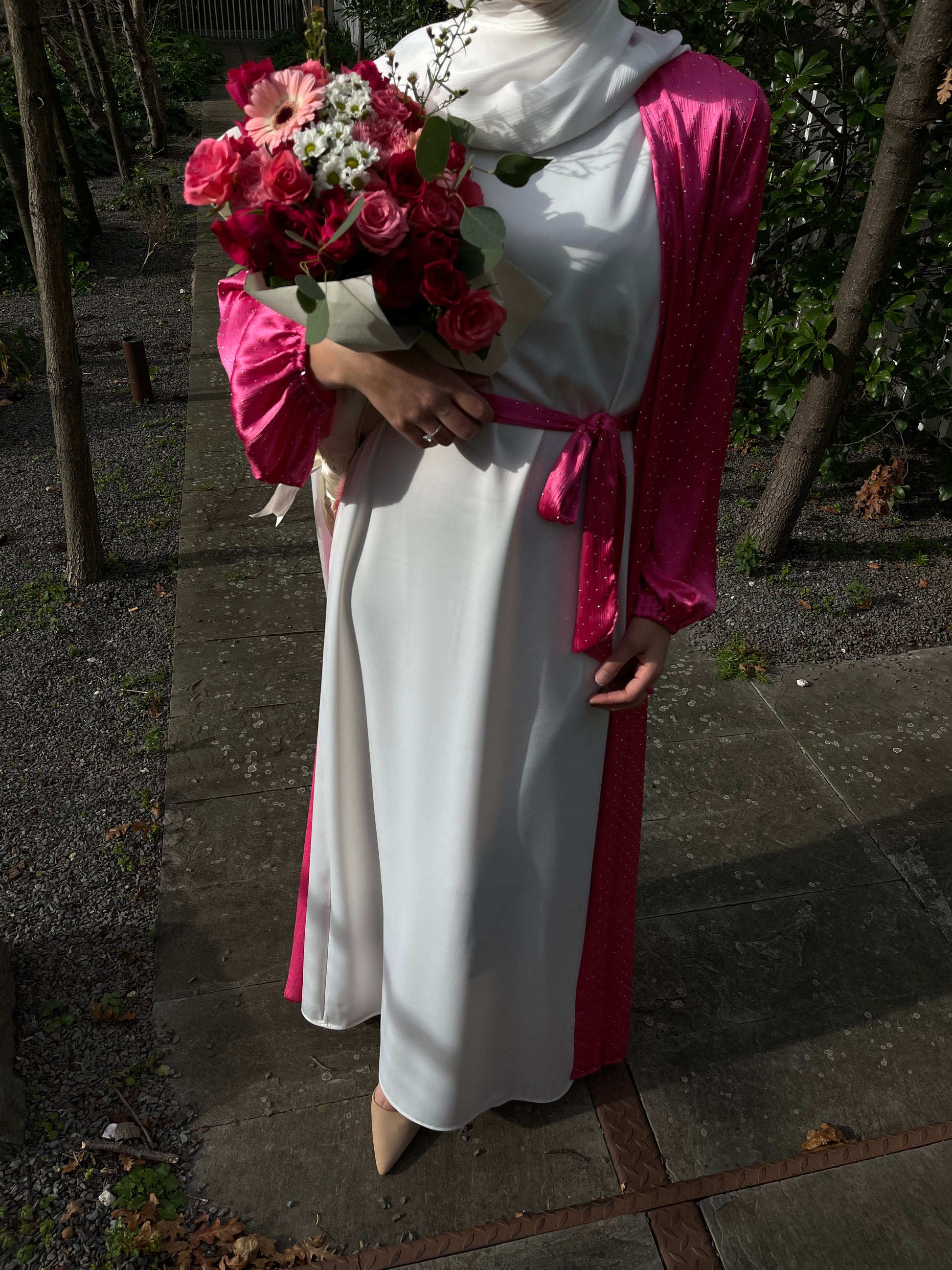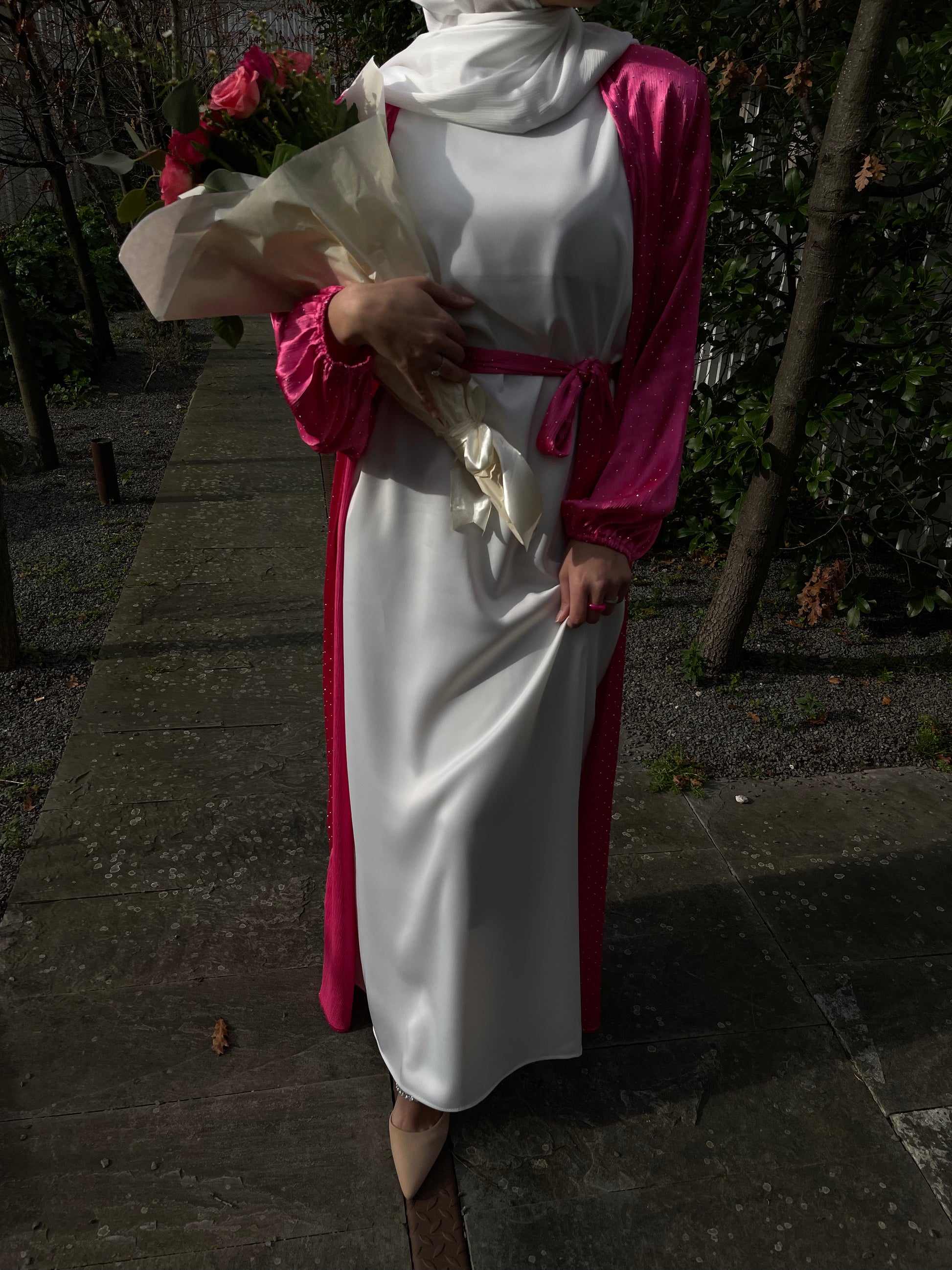 Long kimono fushia entièrement orné de strass, accompagné d'une ceinture.