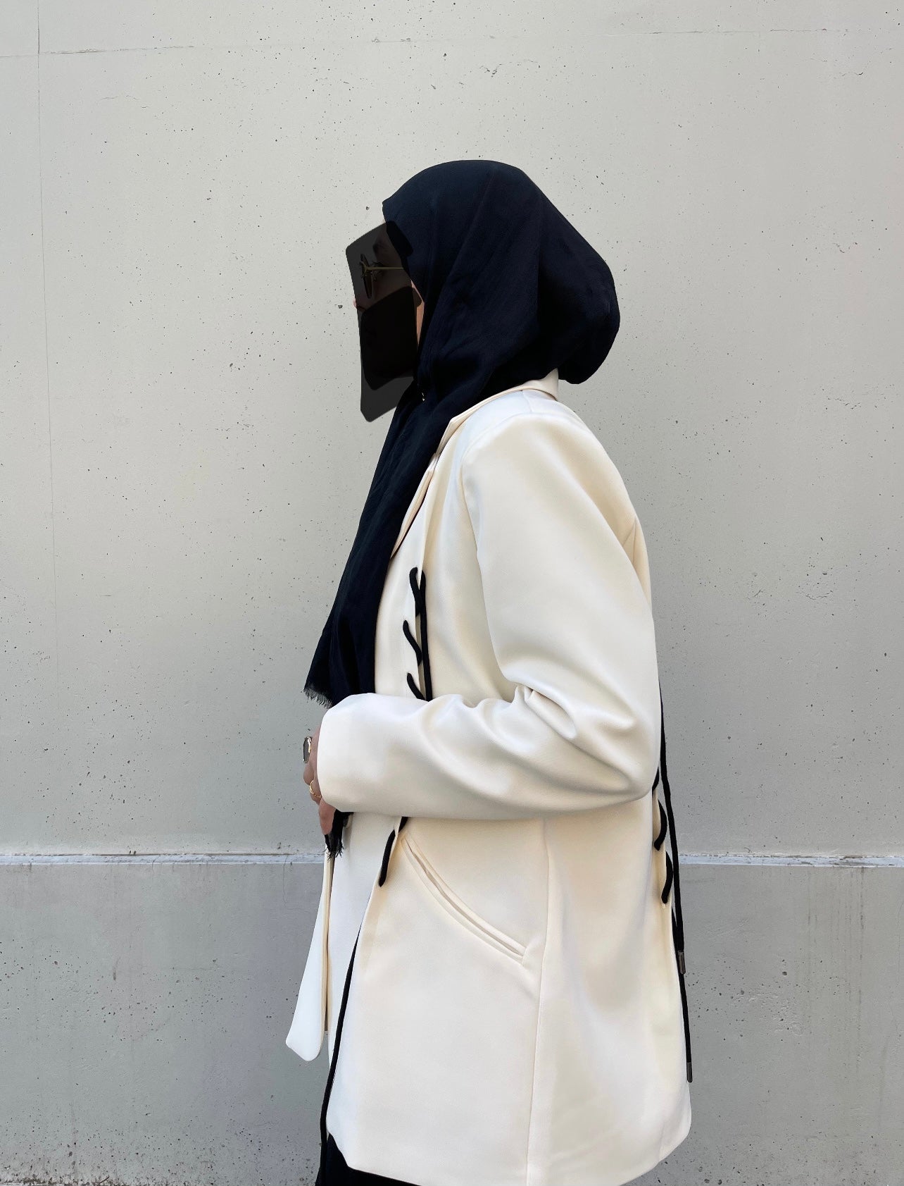 Blazer de couleur blanc ivoire avec des lacet noir sur le devant et derrière.