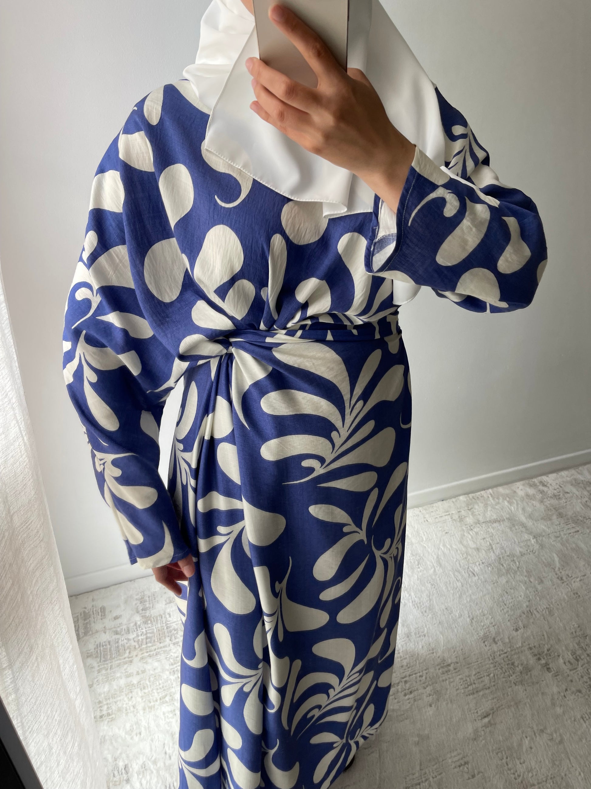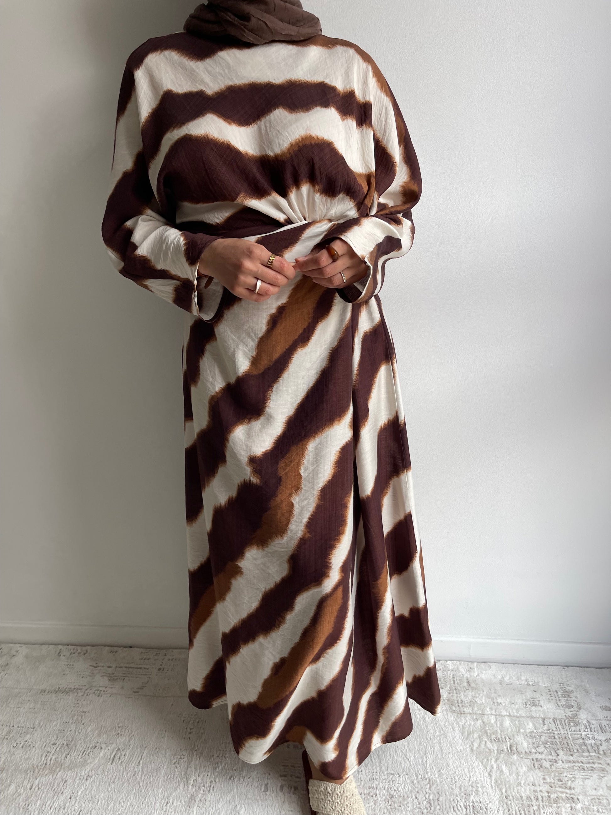 Longue robe à nouer, manches dolman, tissu en viscose léger.